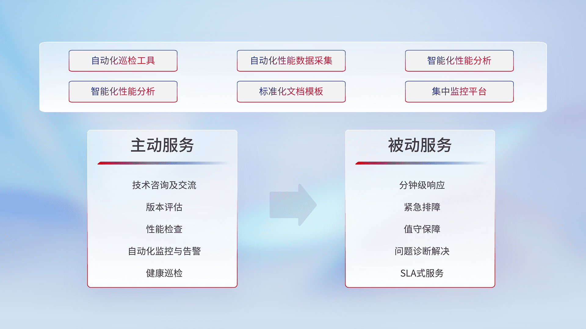 智能化工具和标准化文档,,保障服务质量,,,,提供主动服务(包含技术咨询、、版本评估、、、、性能检查、、自动化监控与告警、、、、健康巡检)和被动服务包含(分钟级响应、、、紧急排障、、、、值守保障、、、问题诊断解决、、、SLA服务)。。。。